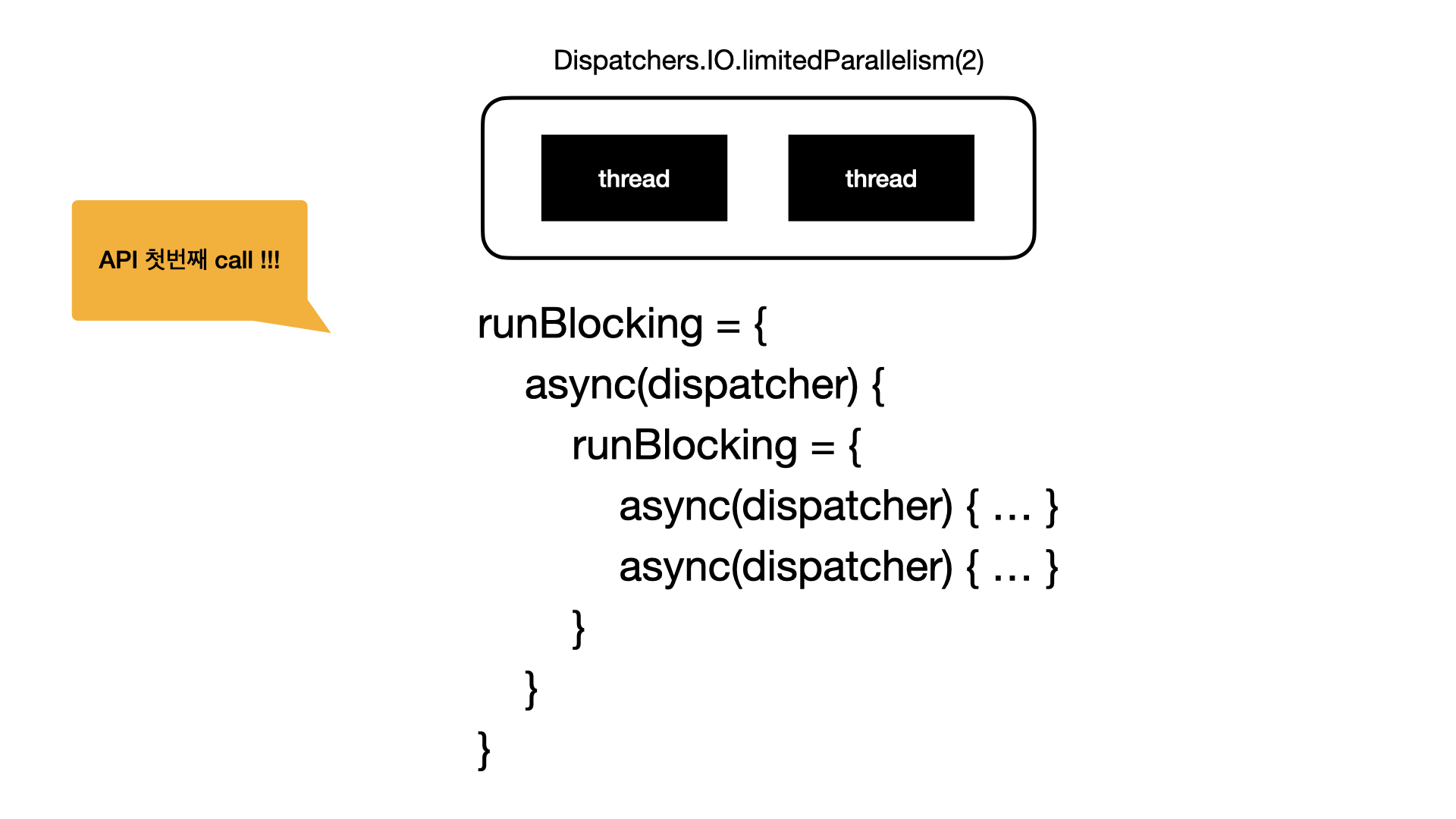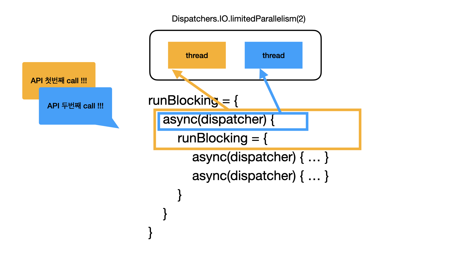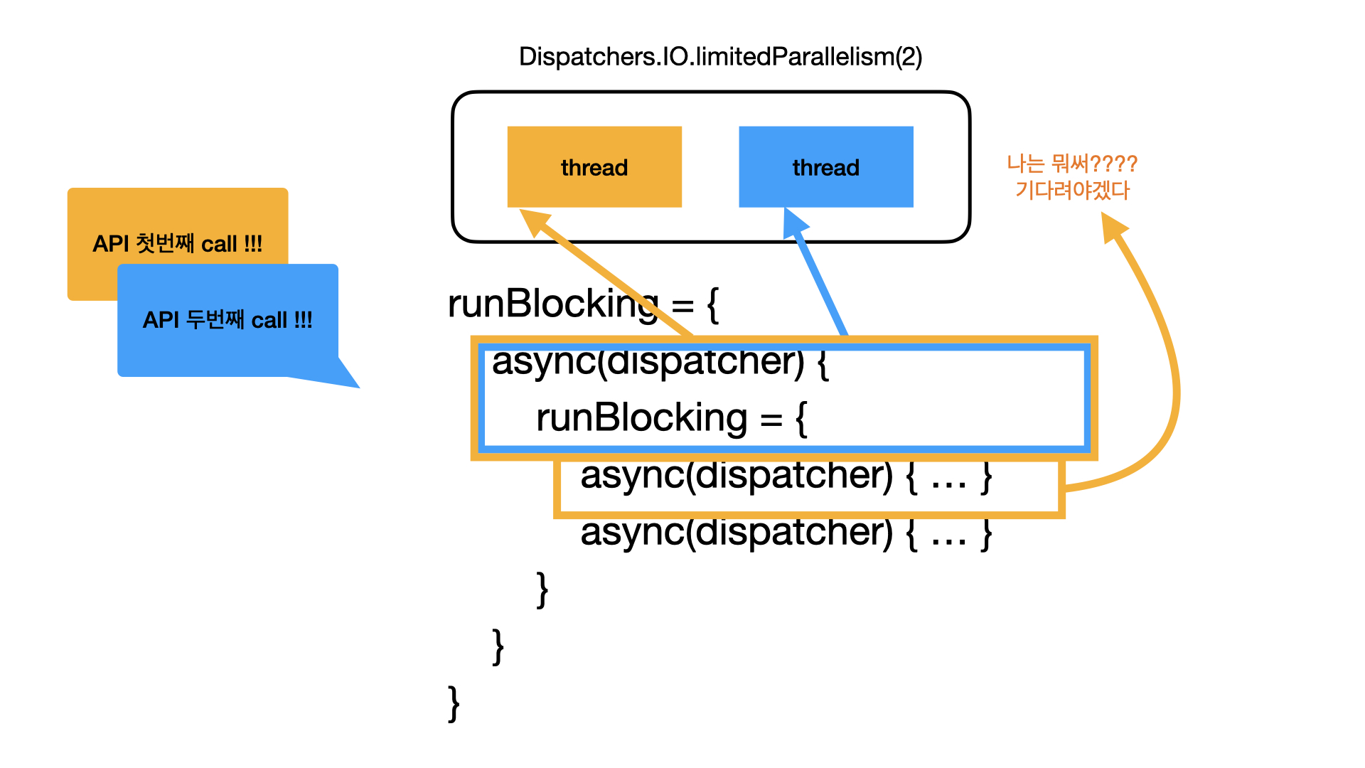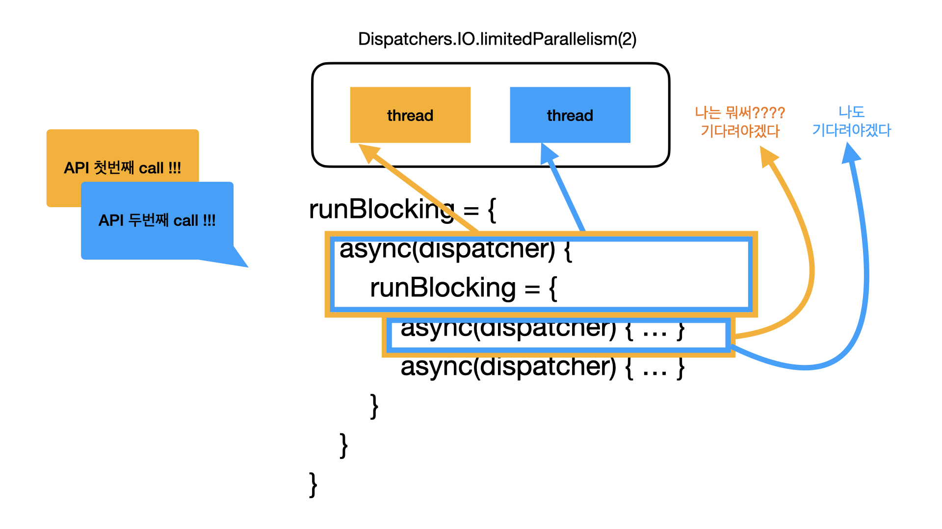 - runBlocking은 현재 스레드(= 첫 번째 스레드, 2번 라인의 async(dispatcher)를 실행하던 스레드)를 블록 한다.