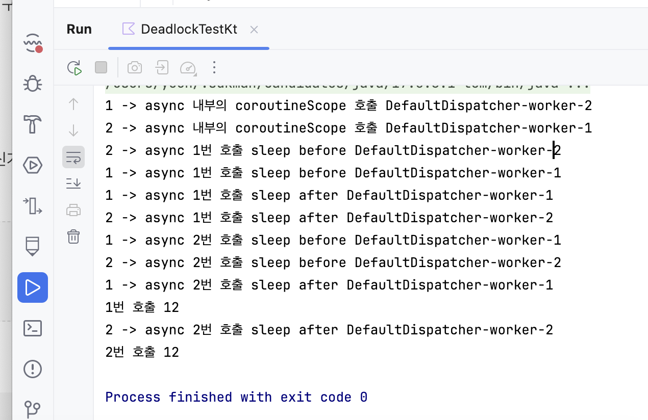 println("$index -> async 내부의 runBlocking 호출 ${Thread.currentThread().name}")