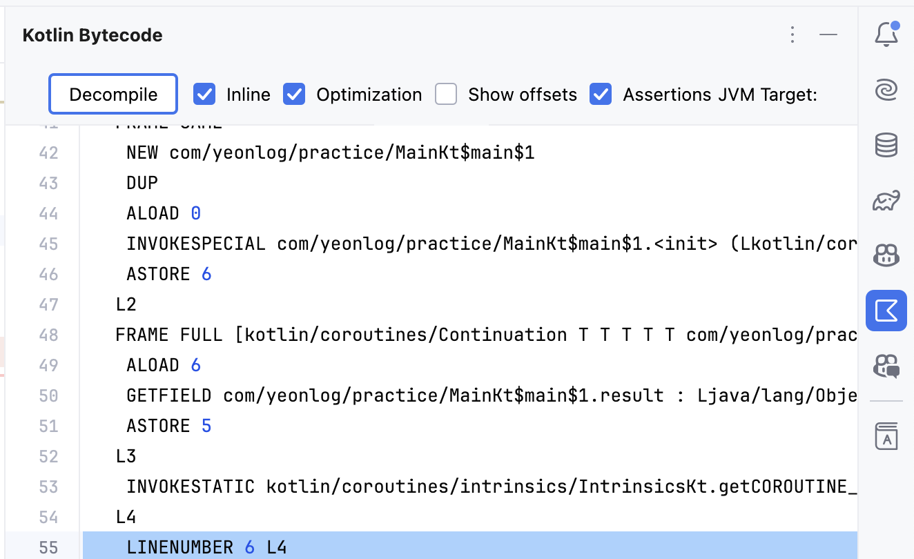 코루틴이 어떻게 동작하는지 공부하기 위해서 분석해 보는 게 재미있어 보였다. 단순한 케이스에서는 바이트코드를 분석해 볼 수 있겠지만, 여러 클래스가 긴밀하게 의존되어 있다 등의 복잡한 케이스에서는 바이트코드 분석이 힘들 것 같다는 생각도 들었다.