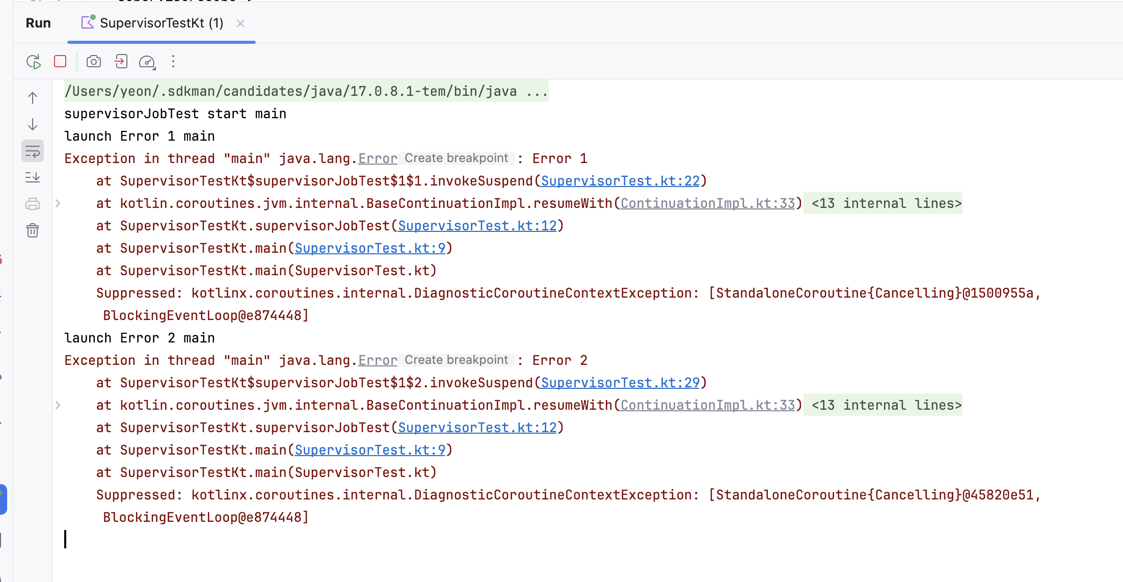두 예제가 동일하게 동작할 것이라 생각했는데 예상과 다른 결과가 나타났다. 왜 SupervisorJob을 직접 사용하면 애플리케이션이 종료되지 않을까? SupervisorJob을 사용한 예제 코드를 간략화하여 다시 가져와보았다. 생성자를 통해 직접 잡을 생성하고, join()을 통해 완료를 기다리고자 했다.