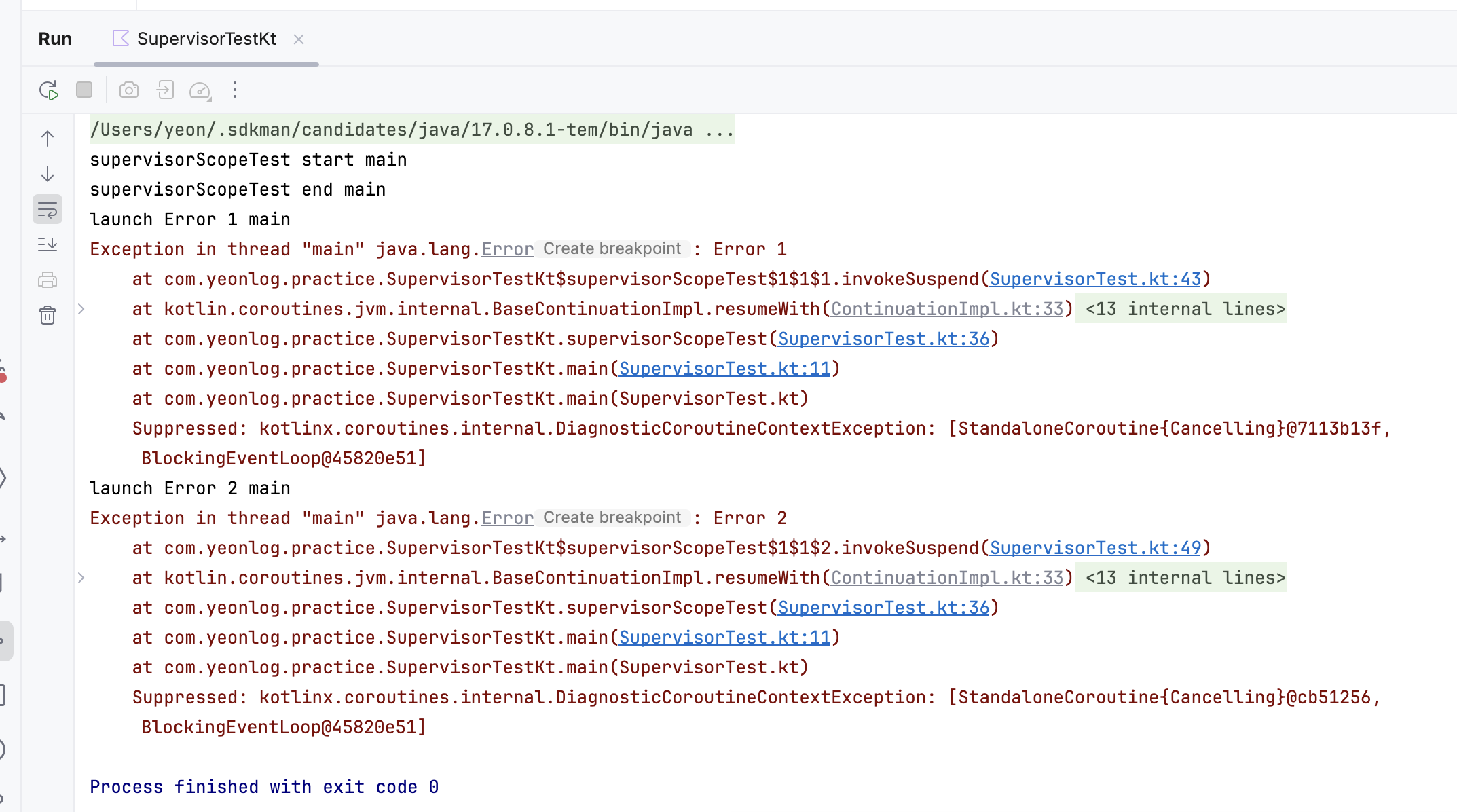 위 과정을 통해 SupervisorJob을 직접 선언해서 사용할 때와 coroutineScope를 통해 사용할 때를 비교해 보았다. 동작 측면에서는 거의 동일해 보이지만, SupervisorJob 예제에서는 잡을 직접 다루기 때문에 발생하는 부가적인 문제들이 보였다.