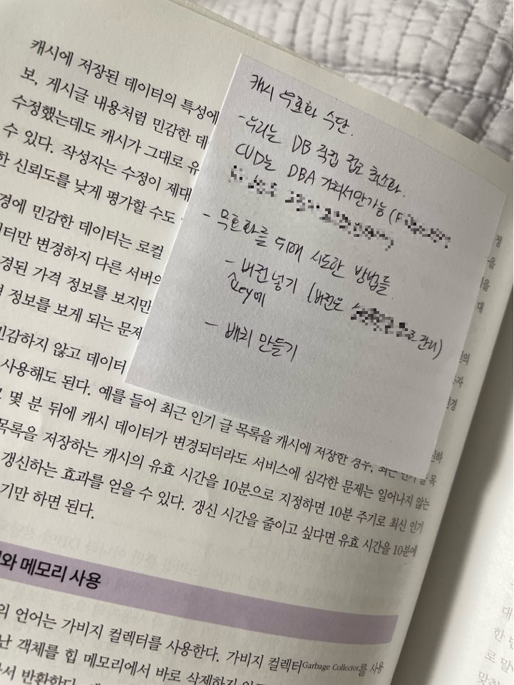 책은 주에 1~2챕터씩 읽었다. 한주씩 스터디를 건너뛰는 일도 잦아서 약 두 달 동안 읽었다. 책은 깊은 지식을 알려주지 않지만 정말 많은 키워드들을 보여준다. 내가 예전에 이런 일도 겪었지, 그때 잘 모르고 넘어갔지만 스터디에 설명하기 위해 다시 정리해 보는 등 내가 진행한 업무를 돌아볼 수 있는 계기가 되었다. 예를 들어 책에 캐시 무효화에 대한 내용이 나오면 우리 팀/나는 캐시를 어떻게 사용하고 있었지? 무효화를 어떻게 시켰지? 어떤 상황에서 캐시 무효화를 시켰어야 했지? 이런 식으로 책 내용에 대해 스스로 꼬리 질문을 달아두고, 해당 질문에 대한 답도 스스로 생각했다.