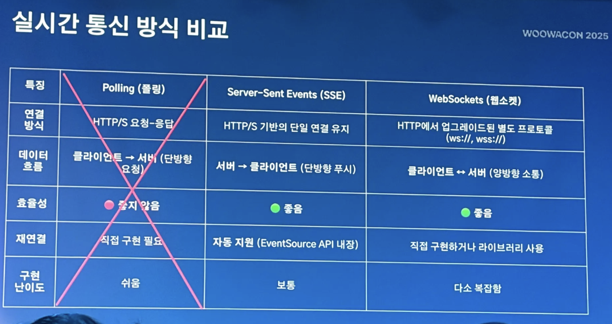 - 웹소켓 방식도 고려했으나 오버엔지니어링이라고 판단, 기존 아키텍쳐와의 정합성으로 인해 SSE 선택