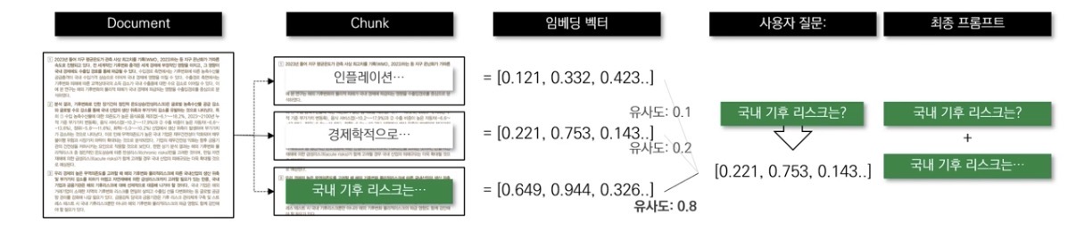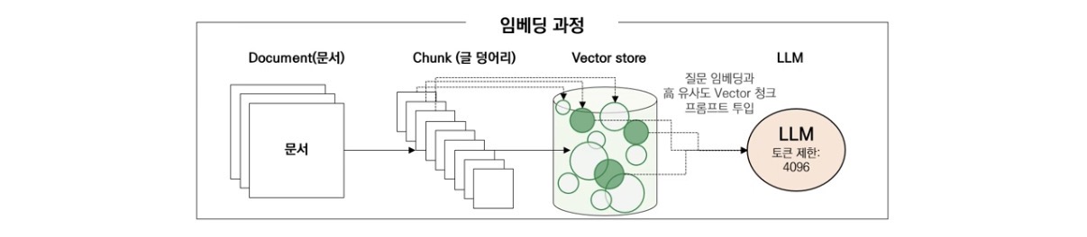 - 여러 개의 청크로 나누기 -> 각 청크마다 적절한 벡터 찾기 -> 벡터를 LLM에게 넘기기