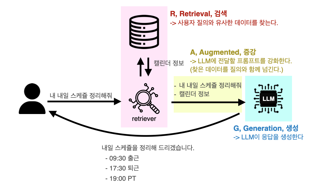 LLM은 학습된 데이터를 이용해 응답을 생성한다. 만약 내 구글 캘린더 등에 저장된 데이터를 기반으로 질문한다면 LLM은 잘못된 정보를 응답할 가능성이 크다.