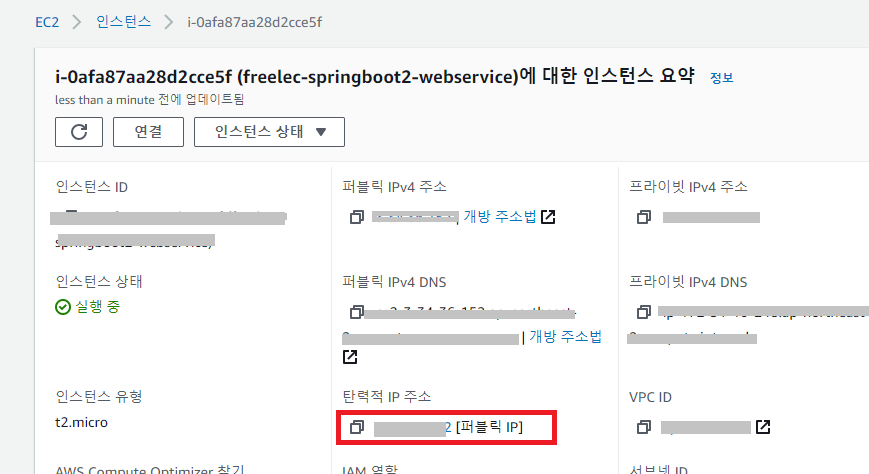 탄력적 IP 주소를 연결 후에 인스턴스로 되돌아가서 잘 연결되었는지 확인해보자