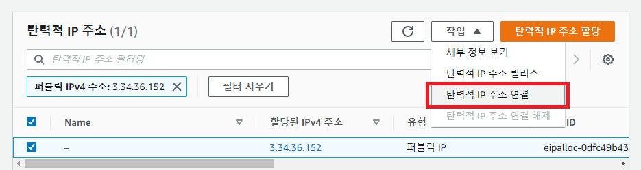 작업에서 탄력적 IP 주소 연결을 클릭한다.