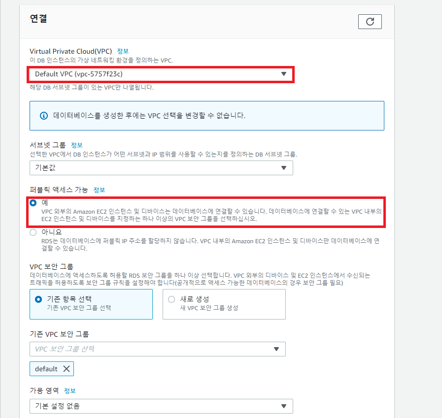 사진 상에서는 default랑 연결되어 있는데 이후 연동 과정에서 계속 오류가 떴다.