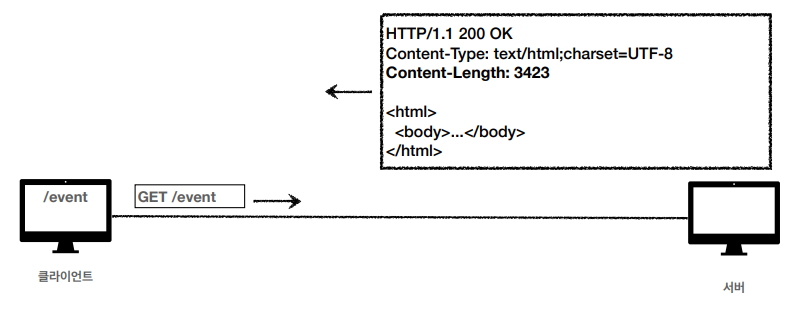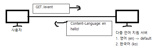 -> 사용자는 /event로 접근하며 Language를 ko로 달라고 했다. 서버는 ko 값을 받고, 메시지 '안녕하세요'를 보내준다.