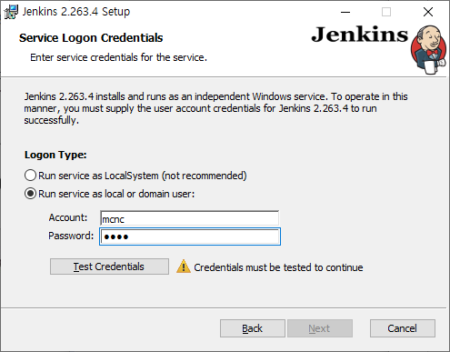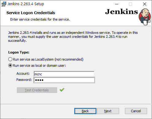 this account ... 에러: stackoverflow.com/questions/63410442/jenkins-installation-windows-10-service-logon-credentials