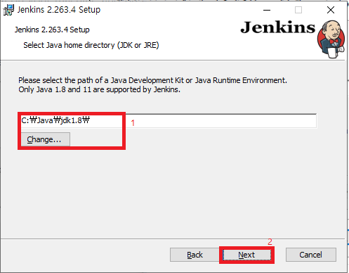 LocalSystem의 권한으로 수행하느냐, Jenkins 접근용 local/domin user를 생성하느냐의 차이인데, LocalSystem은 루트 같이 권한이 많은 편이다. Jenkins의 해킹/버그가 시스템 전체에 영향이 갈 수도 있으므로 not recommended 가 뜨는 것 같다. 기본적으로 작업 수행은 꼭 필요한 최소한의 권한으로 프로그램을 실행해야 보안적으로 좋다.