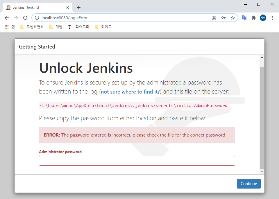 자신의 화면에 나온 경로에 들어가 initialAdminPassword를 확인하고 입력