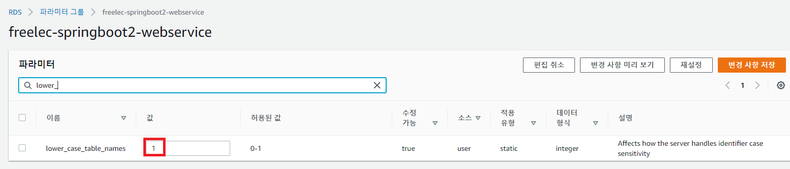 RDS 인스턴스와 엮인 그룹의 설정에서 lower_case_table_names를 변경한다.