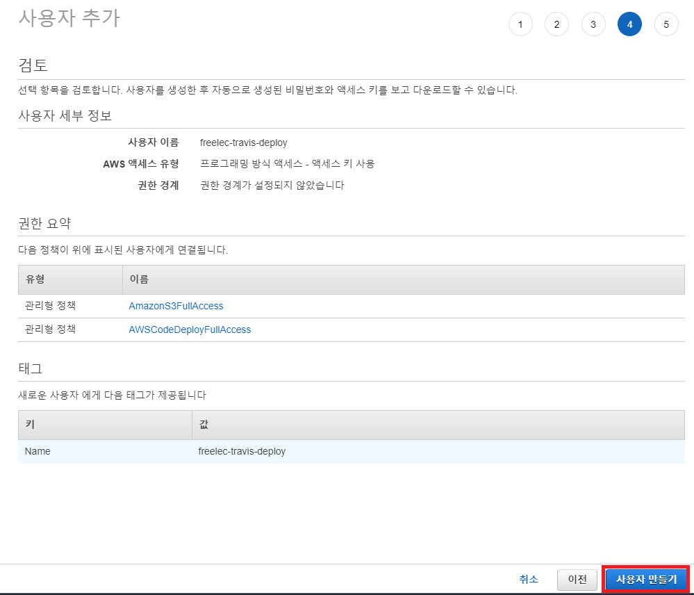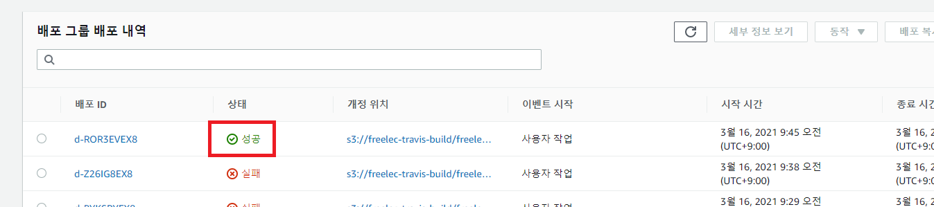 | 2 | Travis CI | → | AWS CodeDeploy | 배포 요청 |