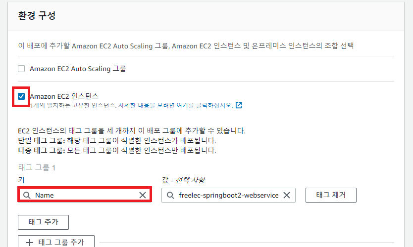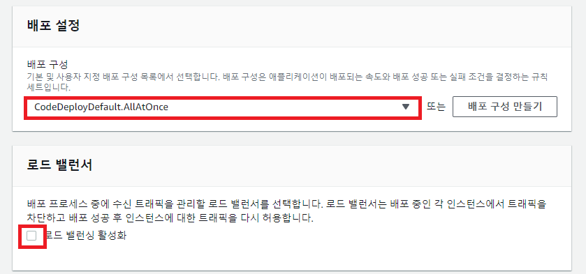 현재 프로젝트의 경우 EC2 하나만 배포하면 되므로 배포 유형- 현재 위치, 로드 밸랜서- 비활성화 설정을 해두었다.