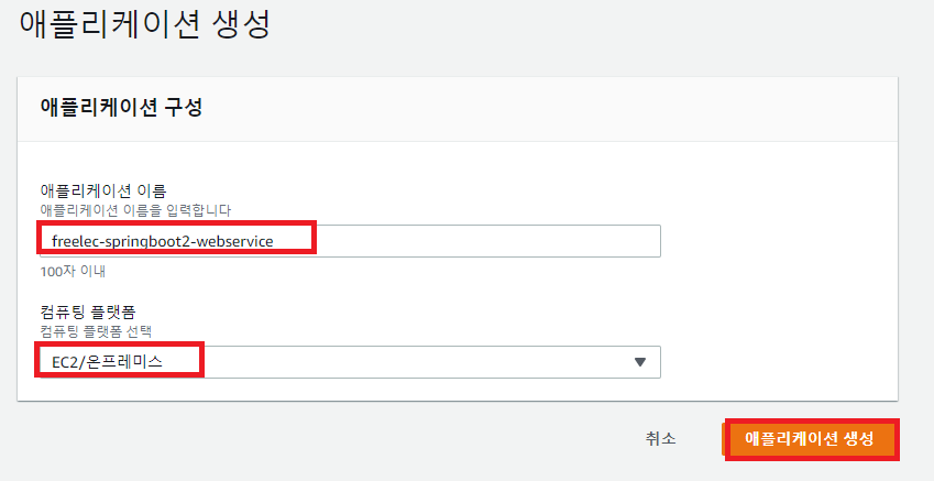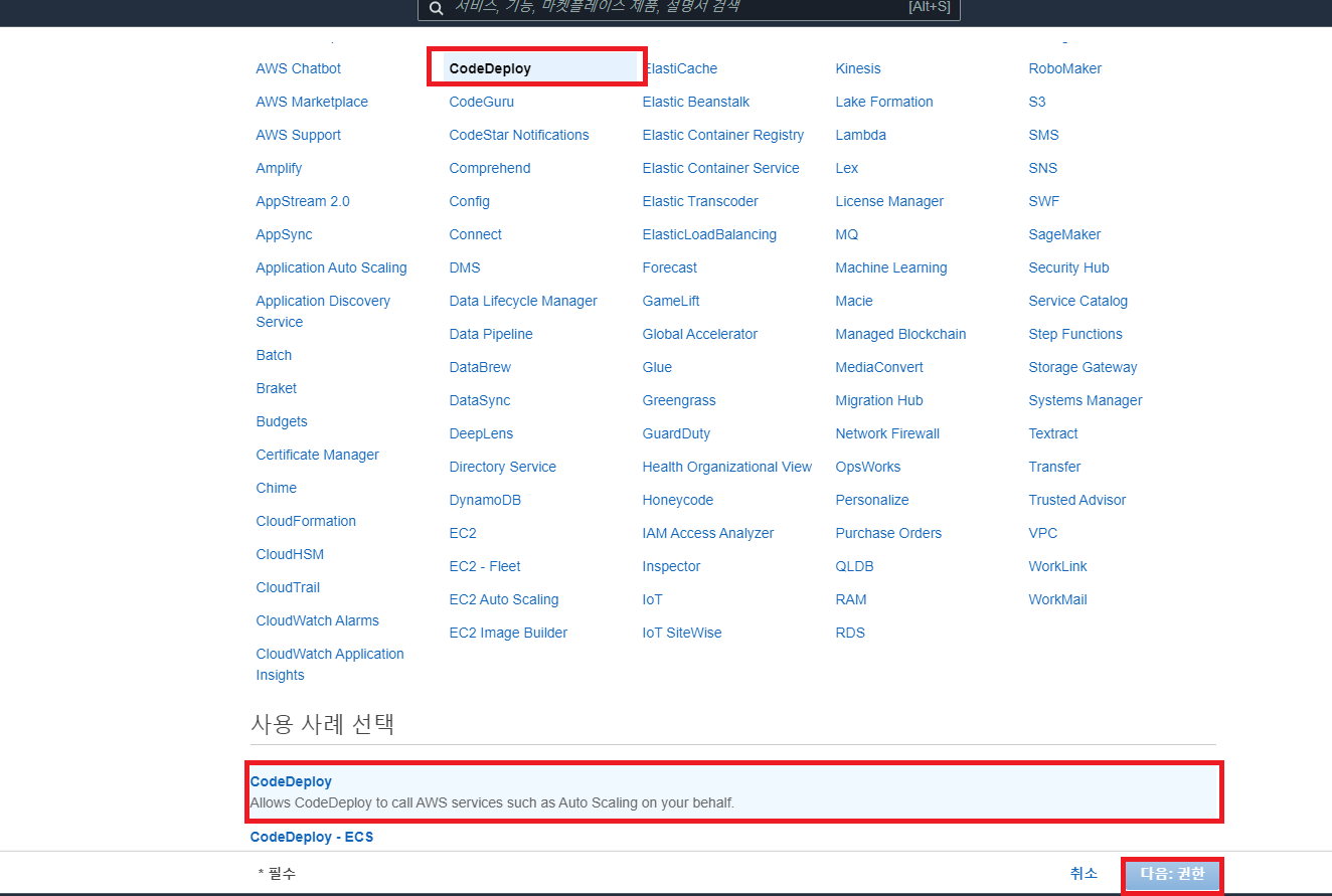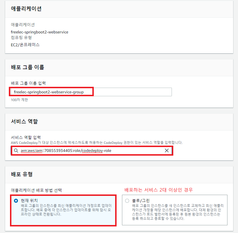 서비스 역할은 4에서 생성한 CodeDeploy용 IAM 역할을 선택하면 된다.
