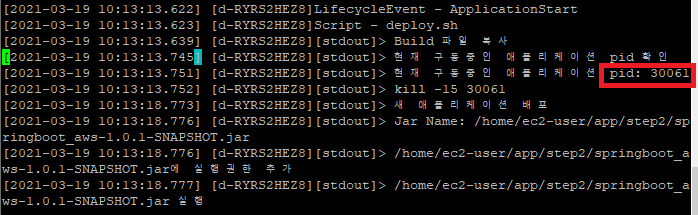 - 스프링 부트 애플리케이션 이름으로 된 다른 프로그램들이 있을 수 있으니 $PROJECT_NAME으로 된 jar 프로세스를 찾은 뒤, ID를 찾는다.