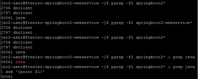 CURRENT_PID=$(pgrep -fl freelec-springboot2-webservice | grep jar | awk '{print $1}')