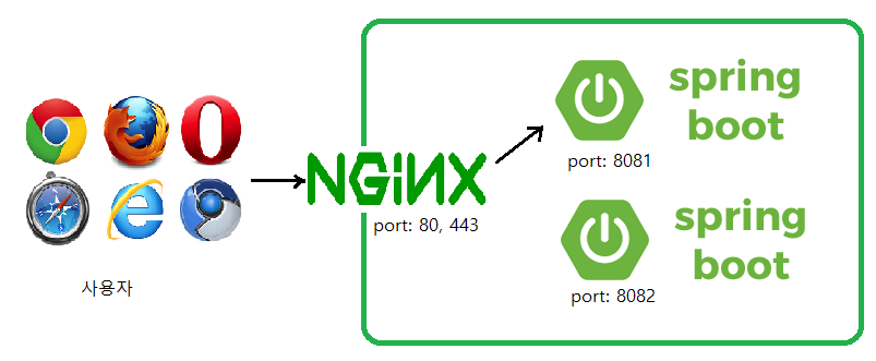 - Nginx는 사용자 요청을 받아 현재 연결된 Spring boot로 요청 전달