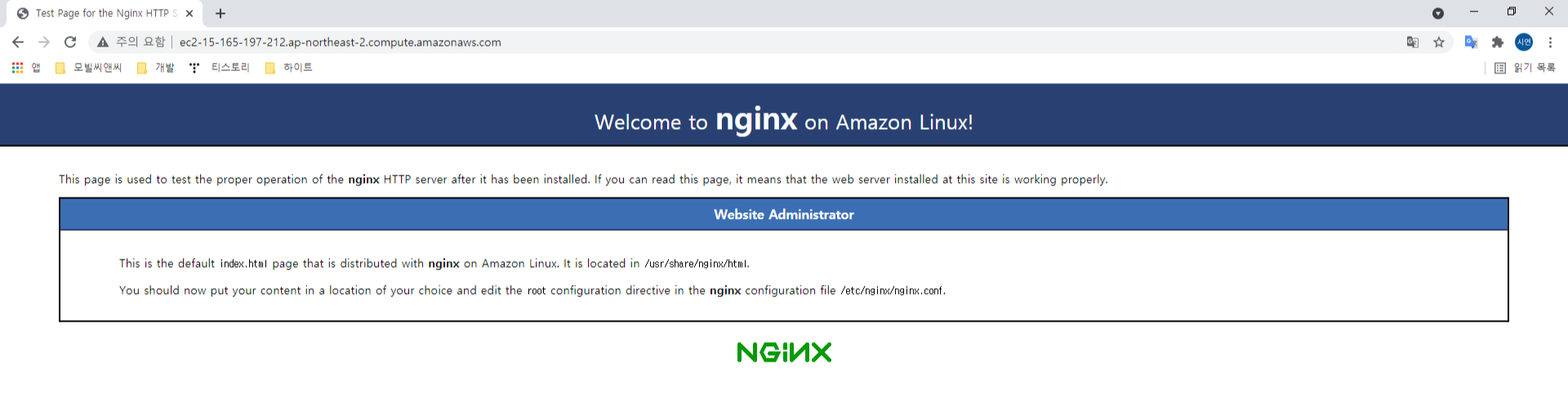 잘 연동 되었다면 ec2 도메인을 이용해 접속했을 때 다음과 같이 뜰 것이다.