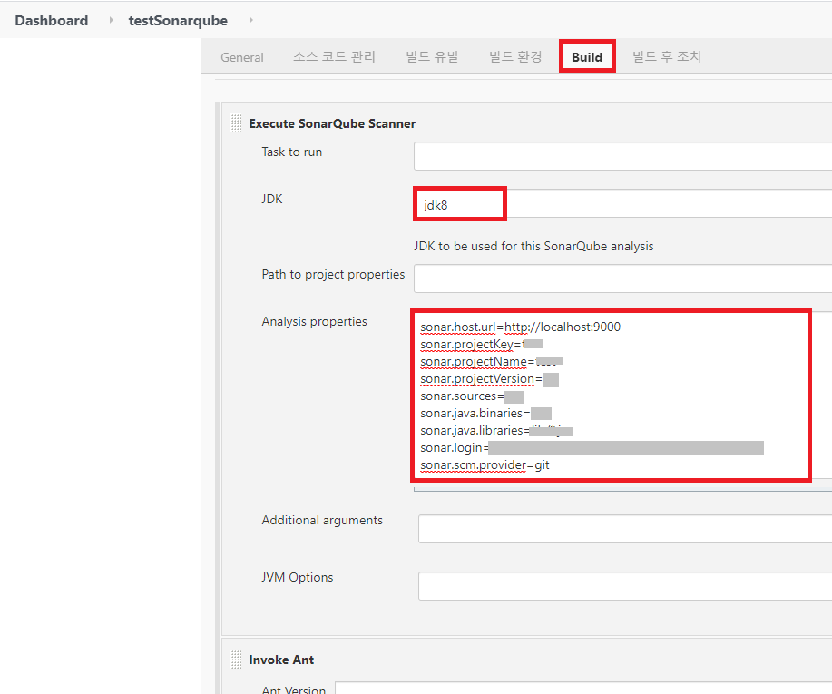 프로젝트 구성 - Build - Execute SonarQube Scanner 추가 - JDK 및 properties 추가