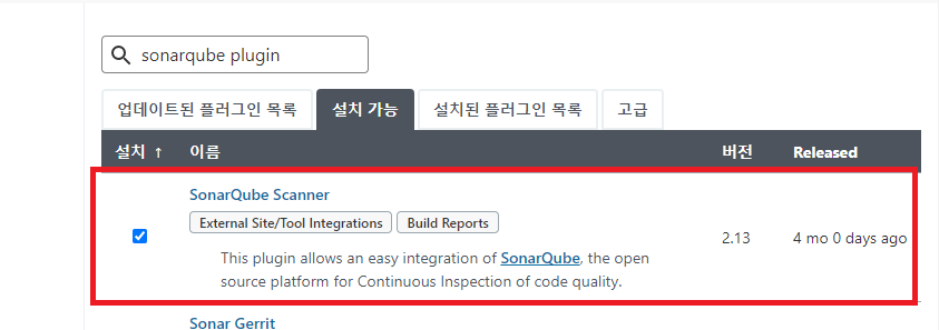 Jenkins 관리 - 플러그인 관리 - SonarQube Scanner 설치