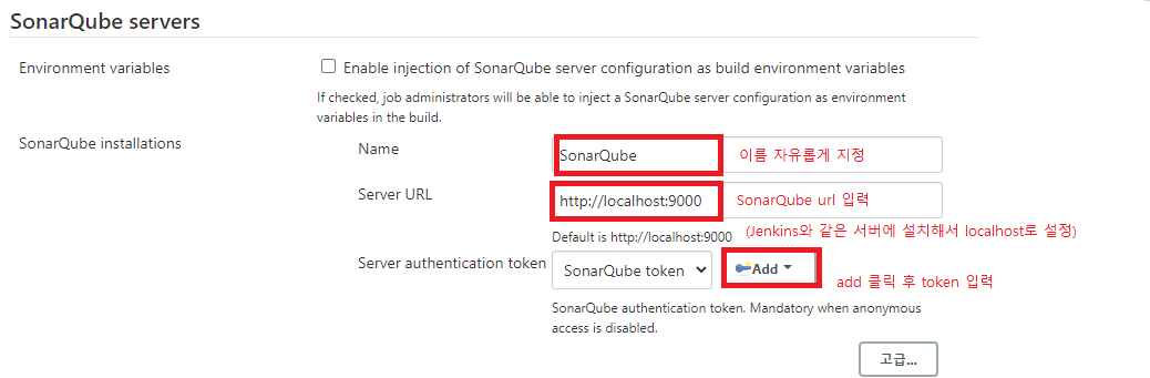 Jenkins 관리 - 시스템 설정 - SonarQube servers 에서 소나큐브와 소나큐브에서 발급 받았던 토큰을 등록한다.