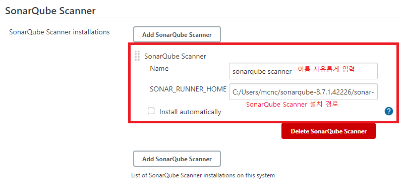 Jenkins 관리 - Global Tool Configuration - SonarQube Scanner - Add SonarQube Scanner 에서 소나큐브 스캐너를 등록해준다.