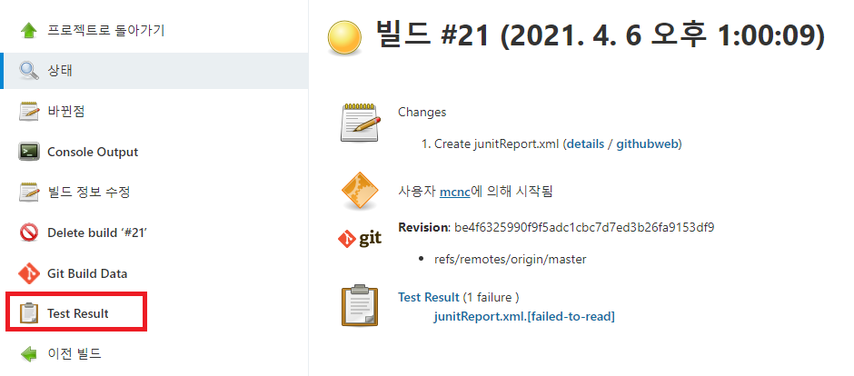 빌드를 돌려보면 노란색 불 또는 파란색 불이 들어오면서 Test Result를 볼 수 있게 된다.