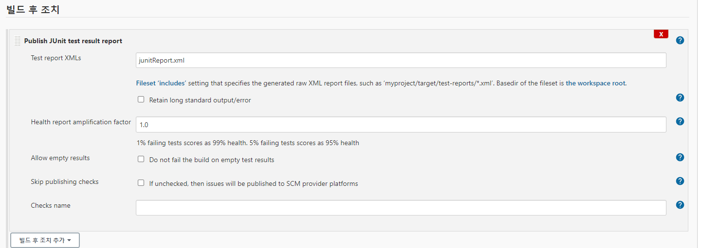 프로젝트 구성 - 빌드 후 조치 - Publish JUnit test result report