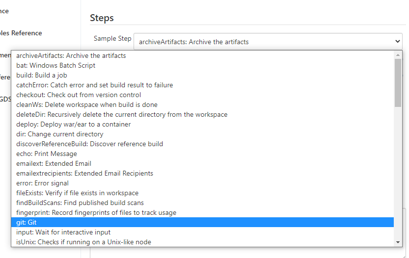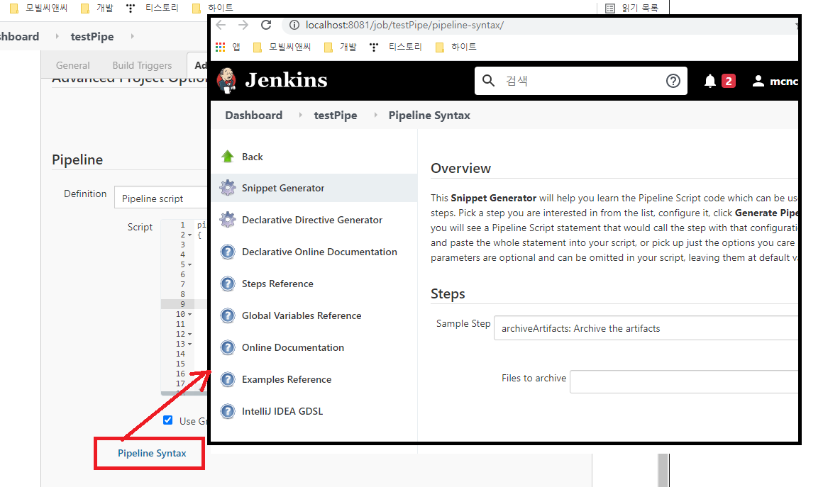 pipeline script 작성하는 부분 아래를 보면 Pipeline Syntax가 존재한다.