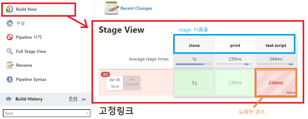 생성 후에 Build Now를 누르면 Stage View에서 결과가 뜬다.