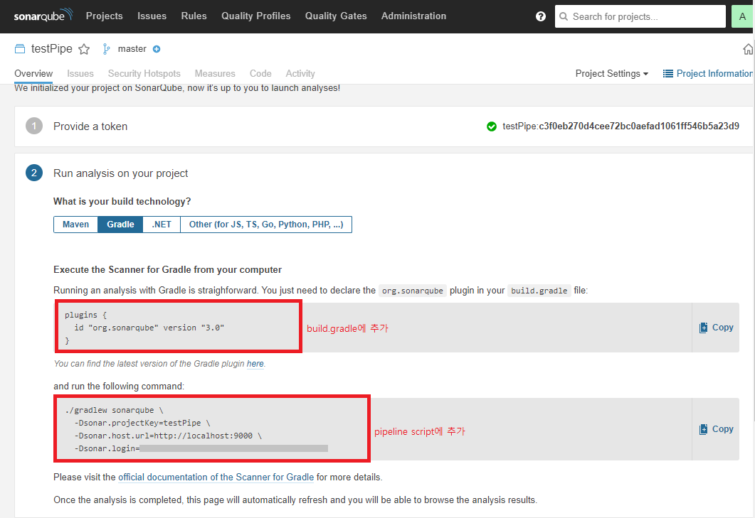 bat './gradlew.bat sonarqube -Dsonar.login=token코드'