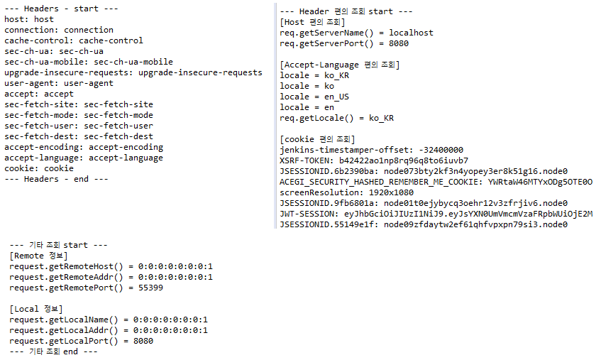 이 외에도 HttpServletRequest의 정보를 알 수 있는 메소드들을 생성했다.