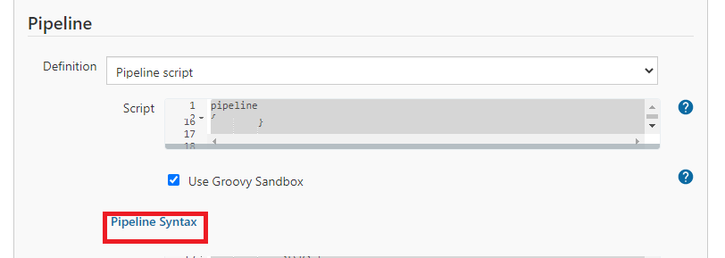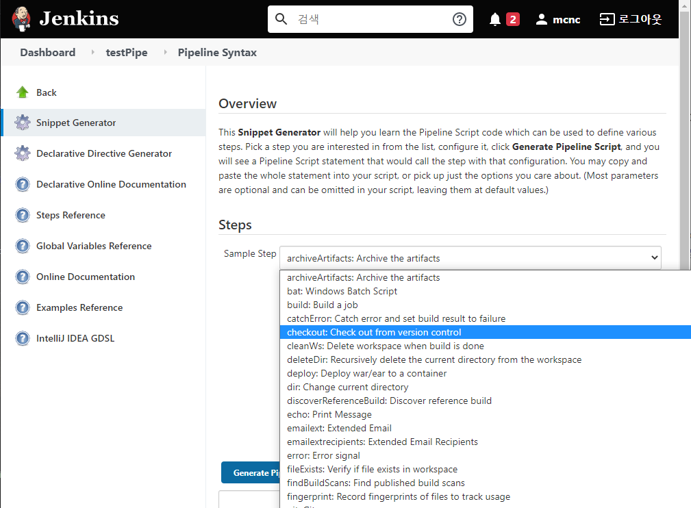 프로젝트의 구성에서 Pipeline script를 입력할 때 하단의 Pipeline Syntax를 누른 뒤에 들어가지는 홈페이지에서,