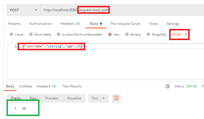 위의 Text와 같은 방식으로 RequestBodyJsonServlet.java를 생성하고 Postman으로 테스트 해보았다.