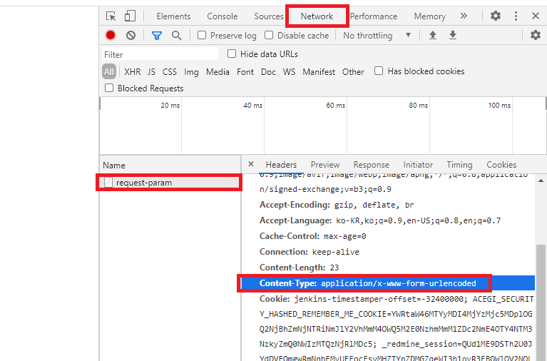 - POST의 Content-Type이 application/x-www-form-urlencoded인 것을 확인할 수 있다.